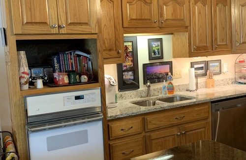 The vaulted ceiling and ceramic tile continues into the kitchen for seamless entertaining. The kitchen has granite on the countertops and the island. It has all new stainless steel appliances (refrigerator, stove with an oven that can be convection or regular, microwave and dishwasher). It also has a separate second oven available in the kitchen for additional use. It has a large island with seating and additional counter space. Kitchen is fully stocked with crock-pots, an electric pressure cooker, two coffee pots (one is a Keurig and the other is a regular coffee pot) and more!