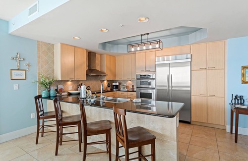 With premium mattresses and luxury appointments in the bedrooms and baths, you'll definitely catch up on some much needed rest and relaxation during your vacation. The master bedroom offers a king size bed and balcony access, and the adjoining glamour bath includes a jetted 2 person tub, separate walk in shower, and twin vanities with vessel sinks. The 2nd and 3rd bedrooms each feature a premium king bed and a private bath and 2nd bedroom also has balcony access. The 4th bedroom offers 2 bunk beds that sleeps 5. The living room sofa can be converted into a queen sleeper, allowing comfortable sleeping accommodations for up to 13!