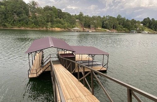 Step onto our expansive dock, complete with a swim deck, covered boat slip, and two covered jet-ski ports. Nestled in a wide cove away from the main channel, our dock offers a peaceful no-wake area for swimming and water activities. Located away from the main channel, our cove offers a peaceful no-wake area ideal for swimming and enjoying the water without the disruption of passing boats. LED lighting illuminates the walkway stairs and swim deck for nighttime enjoyment, while a locked storage closet keeps your refreshments cool and your water toys organized.