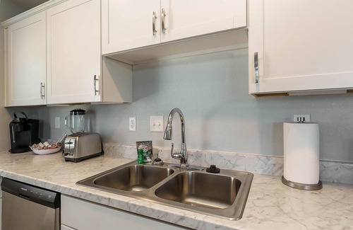 The kitchen has stainless steel appliances, dishwasher, microwave, oven, & refrigerator. The kitchen is fully stocked with plenty of pots, pans, cooking sheets, glassware, mixing bowls, knives & cutting boards, cups, wine glasses, plates, silverware, toaster, blender, & Keurig coffee maker to keep your group caffeinated! There is a complimentary starter set of snacks and coffee to get your stay started off right!
