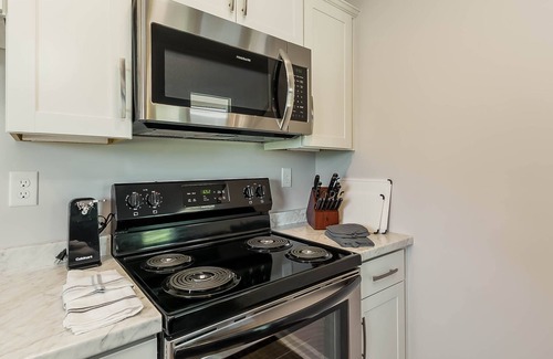 The kitchen has stainless steel appliances, dishwasher, microwave, oven, & refrigerator. The kitchen is fully stocked with plenty of pots, pans, cooking sheets, glassware, mixing bowls, knives & cutting boards, cups, wine glasses, plates, silverware, toaster, blender, & Keurig coffee maker to keep your group caffeinated! There is a complimentary starter set of snacks and coffee to get your stay started off right!