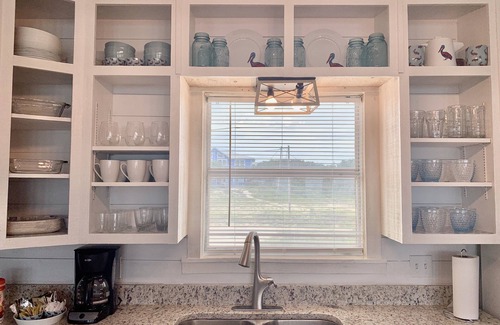 The kitchen fully stocked with everything you’ll need to make yourself at home during your Gulf Shores vacation. Eat inside at the bar or table, or eat outside on the deck.