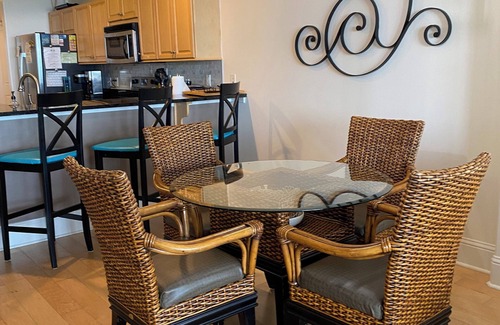 The dining room has a beautiful rattan and glass table seating four as well as additional seating for four more at the bar. Additional dining options available at the balcony table. A small high chair is available for the little ones.