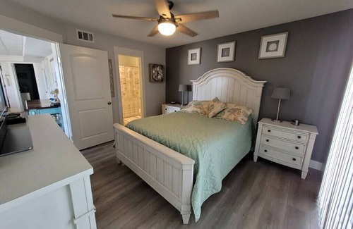 The interior has undergone a complete remodel since Hurricane Sally, ensuring a fresh and updated atmosphere for your stay. The unit features modern furnishings, and the pictures are up to date, showcasing the contemporary design.