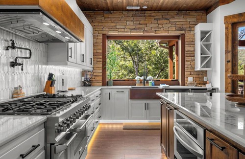 Kitchen – Fully stocked, state-of-the-art designer chef’s kitchen with ample storage and all the latest amenities: gas stove and oven, microwave, pot filler, quartz countertops with fiber-optic underlighting, wine fridge. Large dining table to seat eight and bar seating for five. Dual Keurig, automated Delonghi Italian espresso machine, French press, hot water kettle. Coffee and espresso pods, filters, syrups and creamers provided. Total house water filtration system.