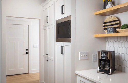 The main level boasts a vaulted ceiling with an electric fireplace and 65" TV. The large kitchen table has room for 8-10 at the banquette and the island can seat 3. The master bedroom has beautiful french doors that open onto the patio or close the blackout curtains for a comfortable rest on the king size bed. The modern barndoor opens into the spacious bathroom with double vanity sinks, oversized shower with a rainhead, standard, and handheld shower head. You will also find a large laundry room with views of the lake and a fun, modern 1/2 bath on this level.