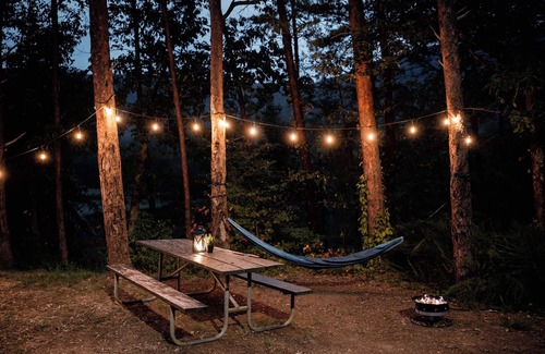 Enjoy your luxurious lake view glampsite, which includes 1 king bed, 2 sets of bunk beds, a Keurig Coffee maker, mini fridge, outlets for your devices, and a personal A/C & heating unit. Also provided at your site will be a fire pit, string lights, camp chairs, a picnic table, hammock and clean campground bathrooms with hot showers. You'll have your own front and back "porch," with chairs to relax in while you enjoy the view.