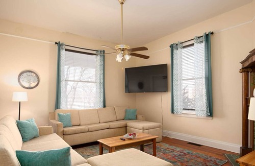 Guests will enter the home through the front door after taking a few steps onto the covered front porch. The foyer will welcome you inside, with the living room on your left and the first bedroom on your right. You'll find a queen sleeper-sofa in the living room, along with extra seating and a large smartTV. Past the living room is the dining room with seating for 6 and the original fireplace. Although the fireplaces are no longer operational, we think it adds wonderful charm to the home! You'll continue through the dining room to the fully-equipped kitchen with access to the backyard!