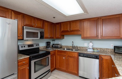 This is a 'Premium' rated condo (with lower than Premium prices). Items such as granite counter tops, large flat screen HDTV, stainless steel appliances, new LVP floors, comfortable living room seating with two rocker recliners and very comfortable beds will be in this condo. This is unit 1012, on the 10th floor. Sorry, NO pets, NO Smoking and the person checking in has to be 25 years or older. !!!KIDS SPLASH PAD!!! IS A BIG HIT! Kitchen is fully stocked with all the utensils you'll need. Keyless Entry doors (no Keys, codes furnished at check-in).