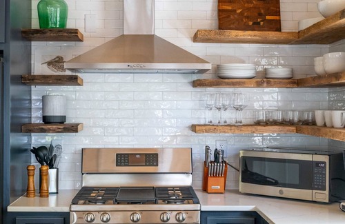 In the kitchen are white Quartz countertops, reclaimed wood open shelving, Café quality stainless steel appliances, Granite non-stick cookware (full set), Moccamaster gourmet drip coffee maker, Dutch oven, retro Haden designer toaster, Chef's cutting board and knife set, plenty of serving and mixing bowls, wine decanter, baking sheet/pan set, blender, and more. The kitchen was outfitted by people who like to cook, and we've chosen items that we personally use and love in our own homes!