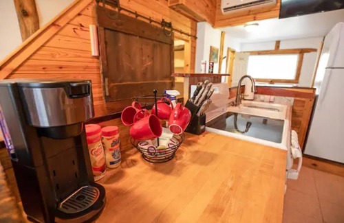 Fully equipped kitchen surrounded by beautiful dark walnut bar, 65" Roku TV w/premium cable, HBO Max, Amazon Prime and many other premium Apps. Plush Aniline leather couch and chair, in house laundry, and upper loft with queen size DreamCloud Hybrid Mattress and Roku smart TV. Also, there is a large covered parking area directly outside of the front door large enough to accommodate 2 small vehicles.